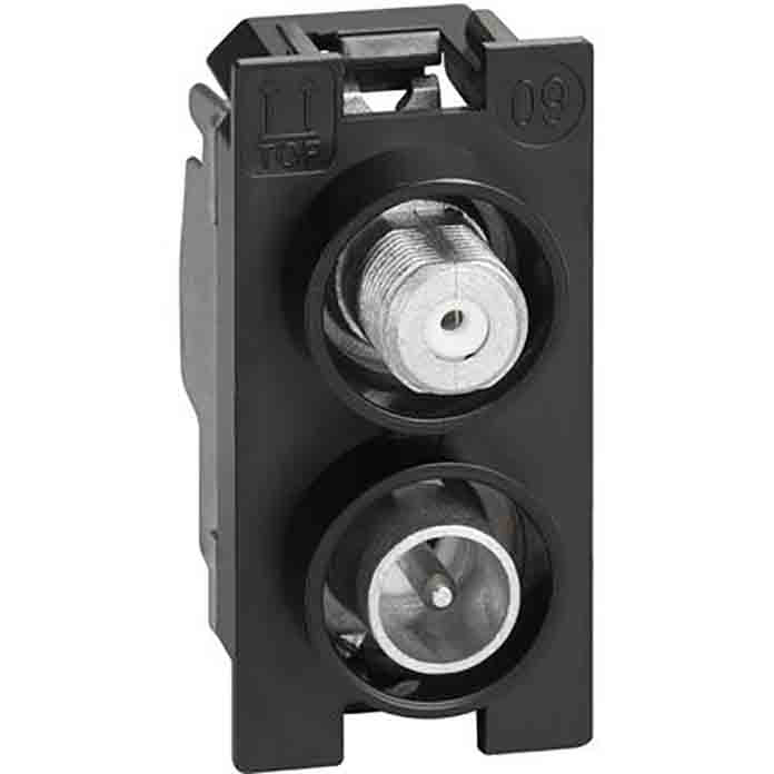 📺 TV/SAT utičnica Type F (navoj) – Living Now 🖤 Crna boja (RAL 7015) – model K4202F 🧩 1M mehanizam, ugradna montaža (snap) 📡 75 Ω, optimizovana za UHD/4K prijem 🛡️ Class A oklop – zaštita od 3G/4G/5G smetnji 📉 Nisko slabljenje signala (do 2 dB) 🏠 IP20 – unutrašnja upotreba 🔧 Kompletira se maskom Type 08 (TV)