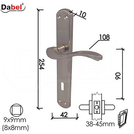 Dimenzije: razmak 90 mm, širina štita 42 mm, visina 254 mm, debljina 10 mm, dužina ručice 108 mm.